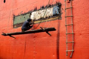 Dhaka, Bangladesh – 14 September, 2018: A construction worker welds on a suspended plank beside a bright red ship hull, using safety ropes. The scene captures industrial maintenance, maritime work, and high-altitude welding on a large vessel.